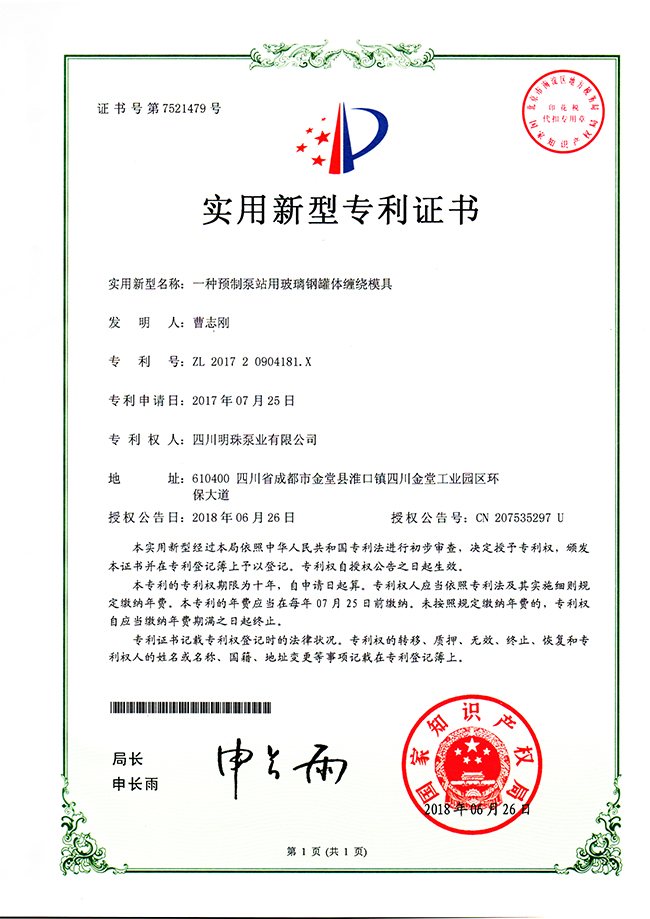 《一种预制泵站用玻璃钢罐体缠绕模具》实用新型专利证书