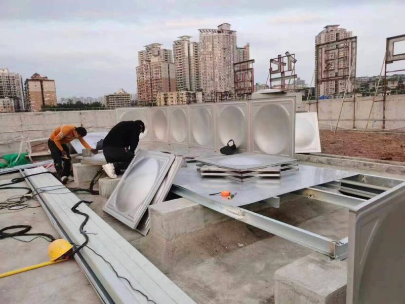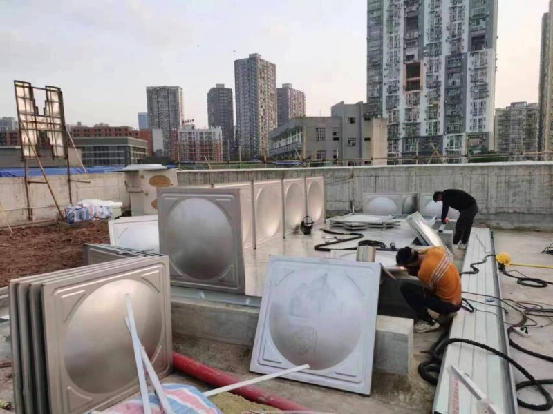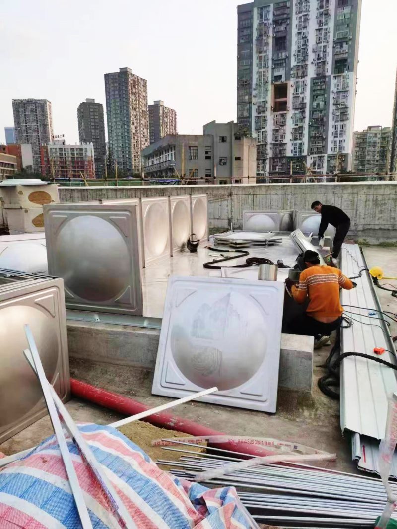 我司不锈钢水箱现场焊接组装安装,应用汉源环保生态项目生活用水!